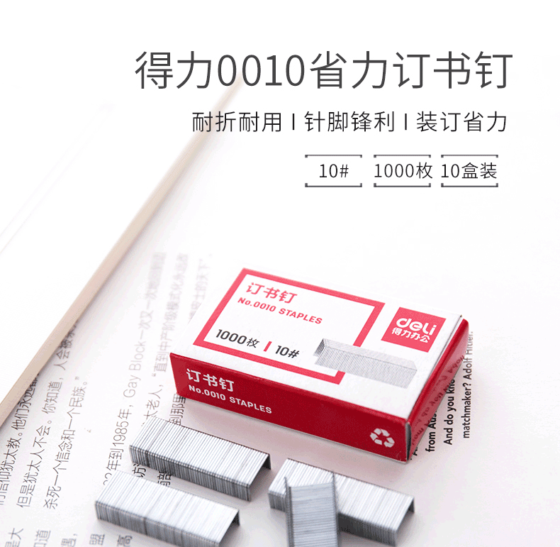 商品名称:得力 0010订书钉1盒10#(1000枚)