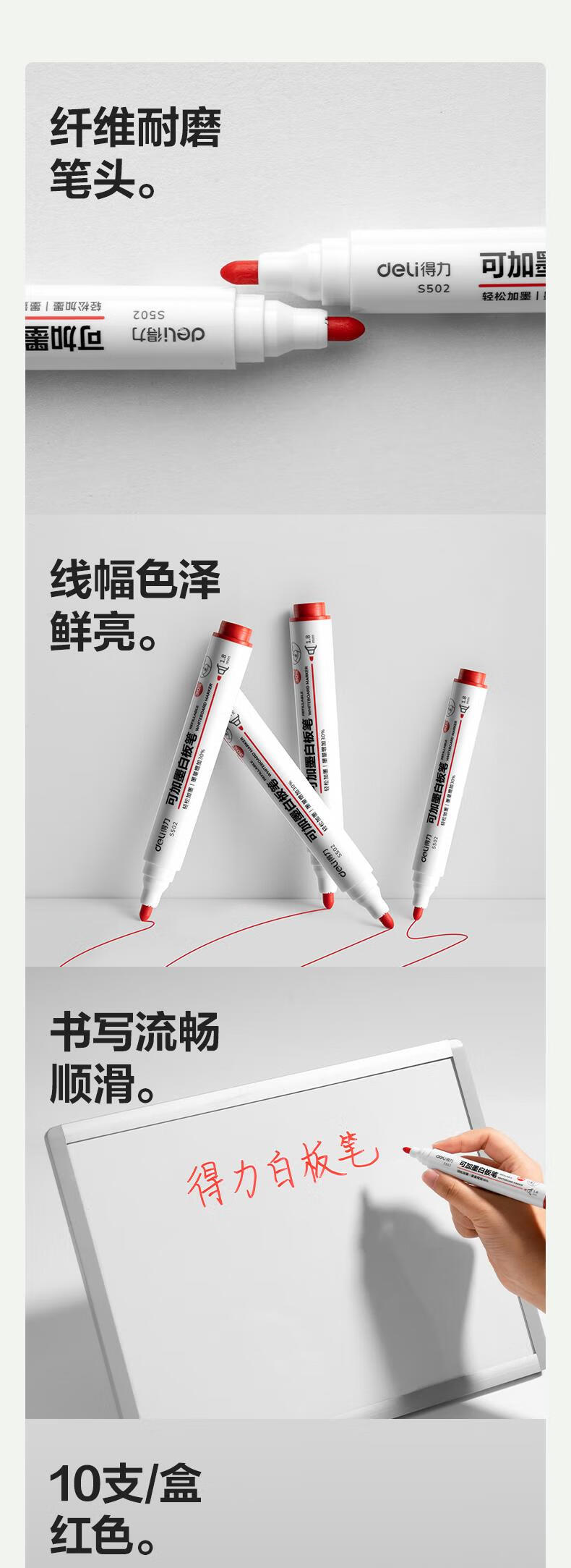 商品名称:得力 红色可加墨白板笔 可擦易擦 10支/盒 S502