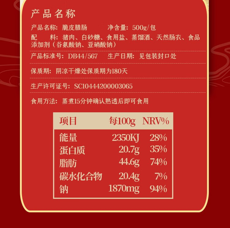 商品名称:荣业 脆皮腊肠500g 广东腊肠特制肠衣 精选猪肉腊肠广东特产